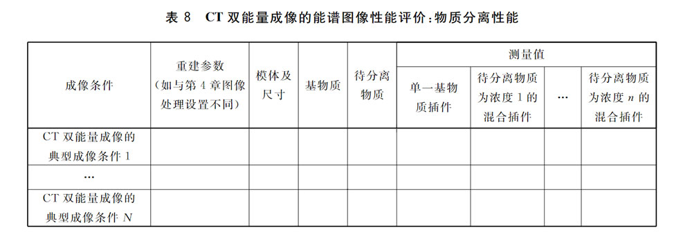 应给出规定的试验条件下所用模体及插件的信息,以及按照规定方法评价得到的不同插件模块对应感兴趣区域的平均CT值。模体信息中应结合物质分离图像类型明确待分离物质及基物质,若对应的图像处理设置与第4章中规定的典型成像条件不同,应当额外说明,结果表达与其他应包含的信息见表8。