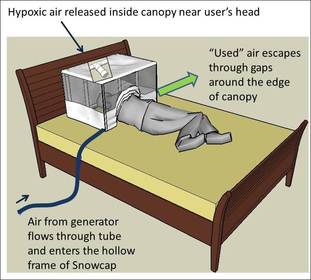 原理 Snowcap 的顶篷带有加重的底部边缘,轻轻地放在您的上半身并包含低氧空气。新鲜的缺氧(低氧)空气流过您的脸部,并通过顶篷边缘周围的小缝隙排出。气流可以重新定向以获得最大的舒适度。由于低氧空气向外流动,普通空气没有机会进来。如果你在夜间抬起天篷,无论是起床还是翻身,你都会看到外面的空气,但迅速被带回高空。如果停电,房间里的空气可以通过顶篷边缘的小缝隙进入,保护您的安全并防止窒息。